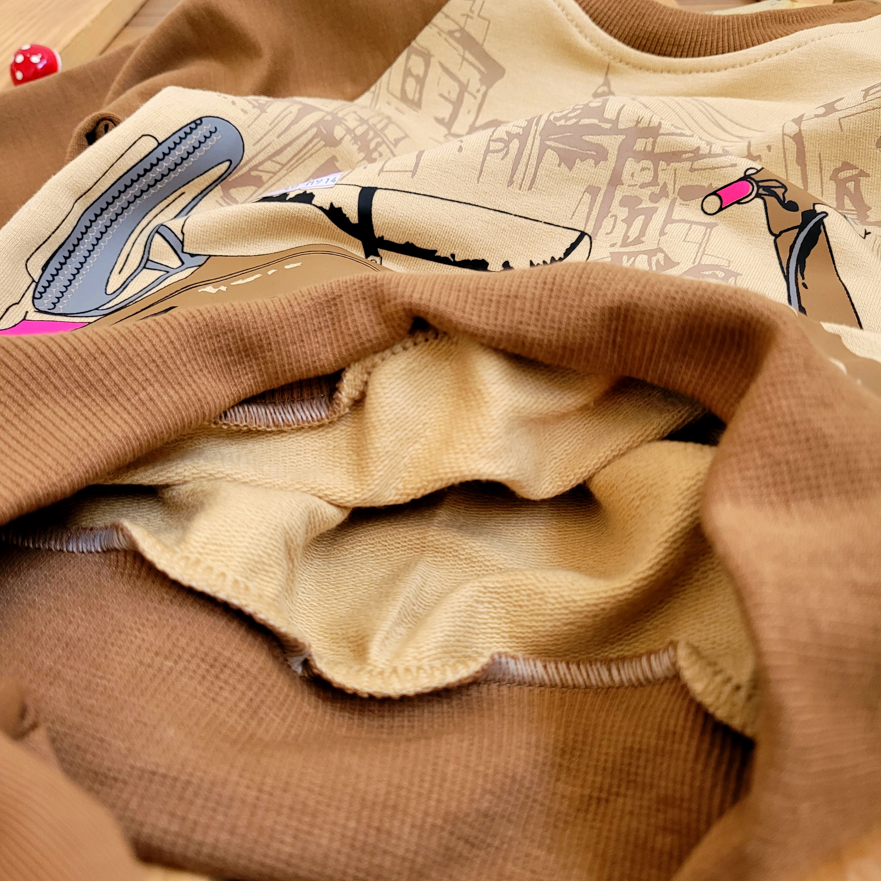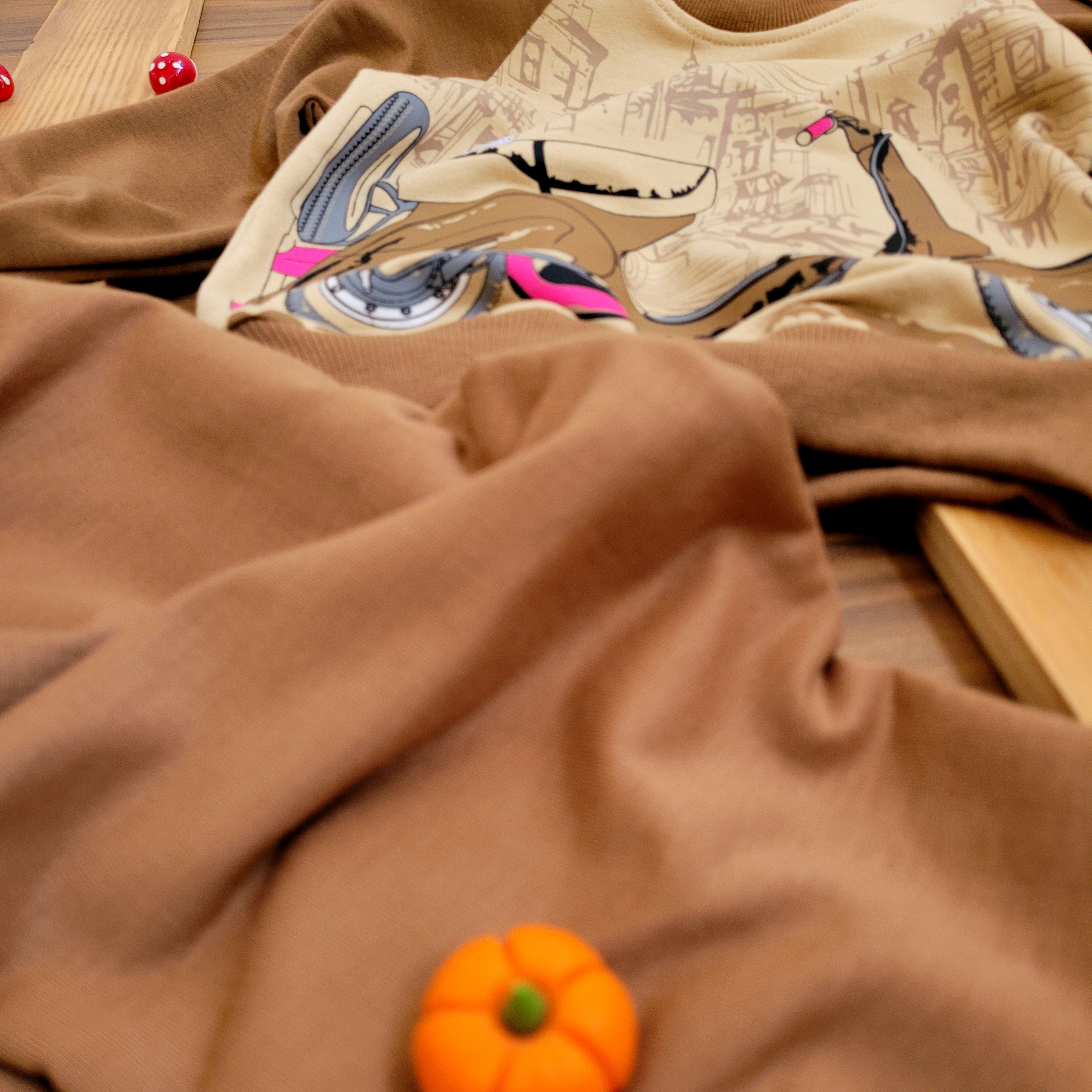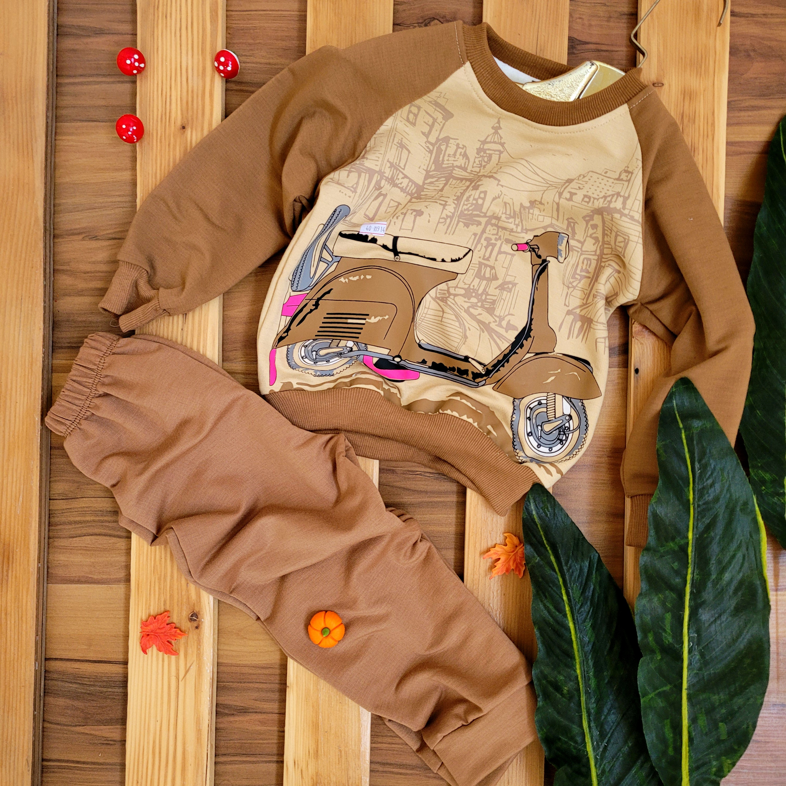 این ست بچگانه شامل یک بلوز و شلوار راحتی با طراحی خاص و رنگبندی گرم قهوهای است. روی بلوز طرح یک موتور کلاسیک با جزئیات زیبا چاپ شده که استایل اسپرت و مدرن به لباس میدهد. پارچه لطیف و سبک آن باعث میشود کودک در تمام طول روز احساس راحتی داشته باشد. کمر و مچهای کشی شلوار و بلوز، آزادی حرکت بیشتری برای بازی و فعالیتهای روزانه فراهم میکند. انتخابی عالی برای استفاده روزمره، مهدکودک و دورهمیهای دوستانه در فصل پاییز و زمستان.